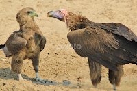 A Lappet-faced vulture confronts a young Bateleur Eagle as the two fight over water rights, as seen in the wilds of Namibia, southwestern Africa.