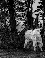 A billie goat above Hidden Lake in Glacier Park stalks a young goat, trying to kill it, to force the nanny into estrus. The nanny successfully defended her kid for 15 minutes until the billie gave up.