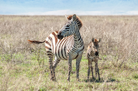 A Zebra standing next to her foal in the grasslands of the Ngorongoro Crater in Tanzania