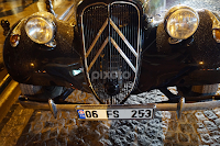 Detail of vintage Citroen roadster grillwork on cobblestone street in Istanbul, Turkey.