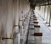 Taps into cistern and seats for purification prior to entry into Blue Mosque, Istanbul, Turkey