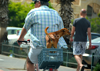 street, bike, man, dog, riding, crate, city