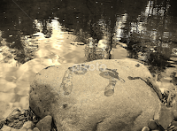 Image taken on a low lying river in Northeast Ohio on a cool Autumn day. A couple dipped their feet in the icy water and imprinted it on a rock closely resembling a heart. Filtered in sepia.